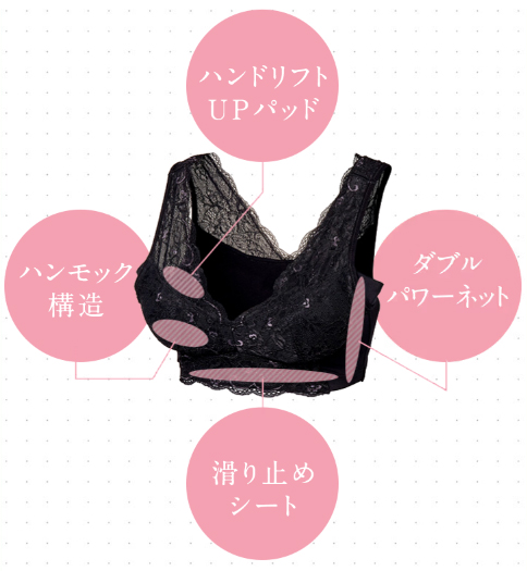 「ルーナナイトブラ」は、脇への肉流れを防ぐダブルパワーネット、おなかへの肉流れを防ぐバスト下の滑り止めシート、パワーネットにパッドを入れてハンモック状にすることでバストへのフィット感を高めたカップ部分のハンモック構造、お肉をこぼさず中央に寄せて自然な谷間を作るハンドリフトUPパッドの4つの工夫で、寝ている間にバストの引き上げや谷間づくりをサポートしてくれます。