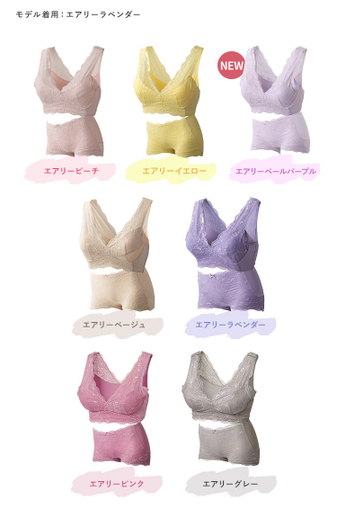 - またエアリーシリーズは、モダンなエアリーピーチ、華やかなエアリーイエロー、洗練されたエアリーペールパープル、深みのあるエアリーラベンダー、定番のエアリーベージュやエアリーグレー、ガーリーなエアリーピンクをご用意。