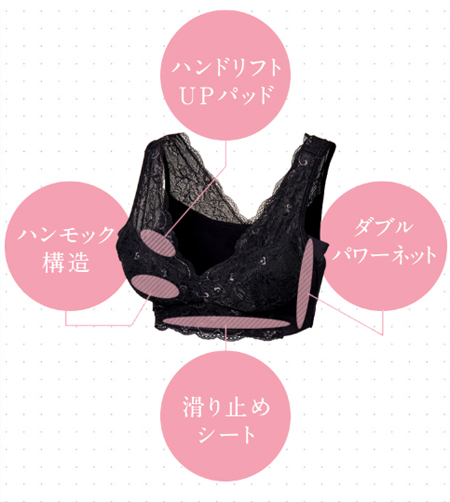 寝返りを打ってもバストにピタッとフィットして逃がさないハンモック構造と、お肉をこぼさず中央に寄せるハンドリフトUPパッドで、くっきりとした谷間を形成。